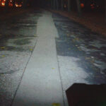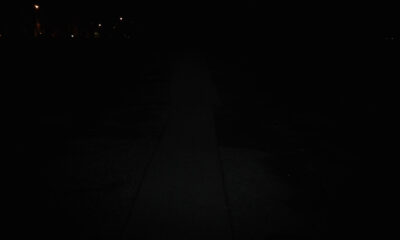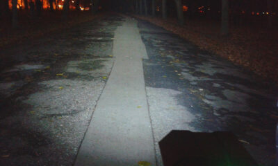 A jobb oldali kép önmagáért beszél. A fényerő három fokozatban állítható, a képen a legerősebbre van állítva, de a két gyengébb fokozat is bőven elegendő a biztonságos tekeréshez. 30-40 méterre el lehet vele látni, a fényvisszaverő felületek és táblák pedig akár 100 méterről is teljesen kivehetők. A három LED-nek köszönhetően nem egy 10 centis pöttyöt tolsz magad előtt, hanem tényleg látod vele az utat teljes szélességében.
