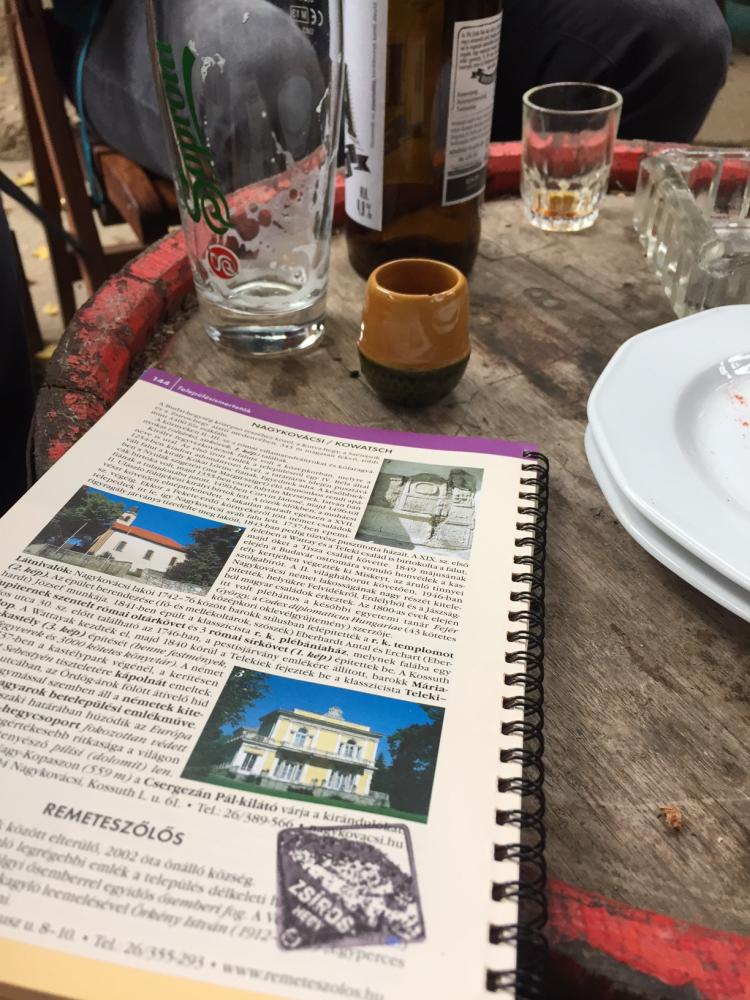 A túránk első része tartalmazta a legkeményebb terepet, tudniillik kisvártatva egy igencsak meredek hegyoldalra kellett felmásznunk. Fizikálisan vagy fizikailag megterhelő volt. Melyik a helyes? Ezen vitatkoztunk, de én utánajártam a dolognak. Mindkettő jó. A Magyar értelmező kéziszótár alapján a „fizikális” szó jelentése: testi, fizikai erő, tényező stb. Tehát a szó helyes és a módhatározóragos alakja is. A hegytetőről pazar kilátás nyílt az alattunk lévő településre. A következő stratégiai pontunk a Muflon Itató volt, ami amúgy a kék kör egyik pecsételőpontja. Kéne az a hülye kiskönyv, hogy pecsételni tudjunk, ahogy az a két túrázó, akik így is tettek. Ezen felbuzdulva úgy döntöttünk, hogy jó lenne egyezer belevágni és netalántán megcsinálni az Országos Kék Kört… Az itatóban zsíros deszkát ettünk lilahagymával, mellé Jagert, unicumot, söröket, ropit, és mogyorót fogyasztottunk, közben meg bőszen számolgattuk a bevitt kalóriamennyiségeket.