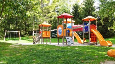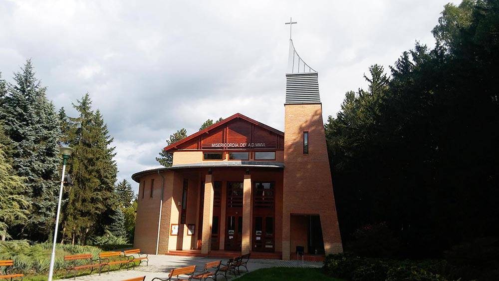 Csalódottan sétáltunk le a hegyről. Megálltunk a Bodahegyi úton a játszótérnél egy kicsit pihenni. Innen két úton lehet eljutni a Gyógyfürdő térre. Ha az Akácfa utca felől megyünk, akkor ezen a lépcsőn kell elindulnunk, vagy mehetünk Termál úton, ahol a 2006-ban épült Isteni Irgalmasság Templom előtt fogunk elsétálni.