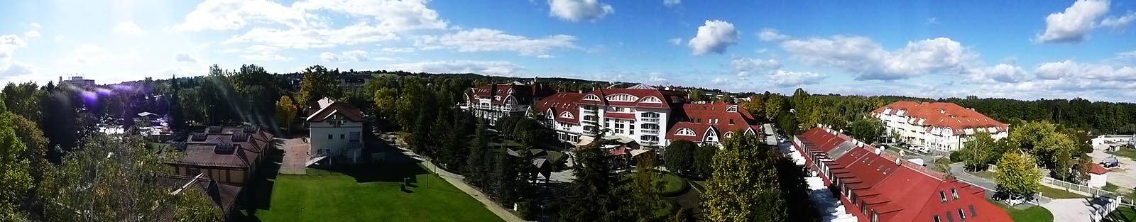 Kaja után átsétáltunk a termáltóhoz. Itt végre találtunk egy kilátót 🙂 A legfelső szintjén rács van a lábunk alatt, tériszonyosoknak nem ajánlott lefelé nézni 🙂 Készítettem egy panorámát a tetejéről: