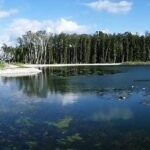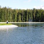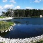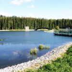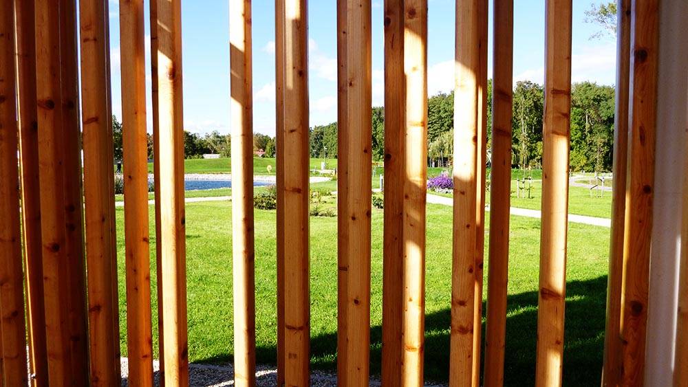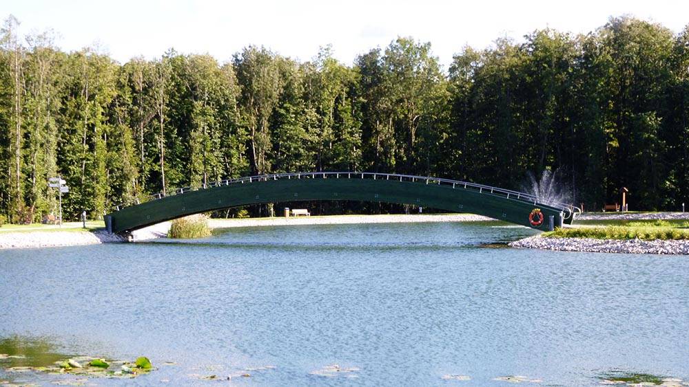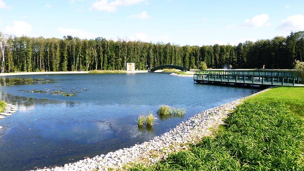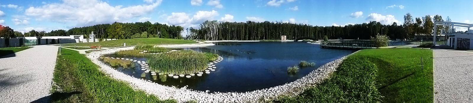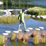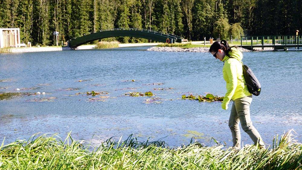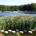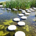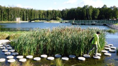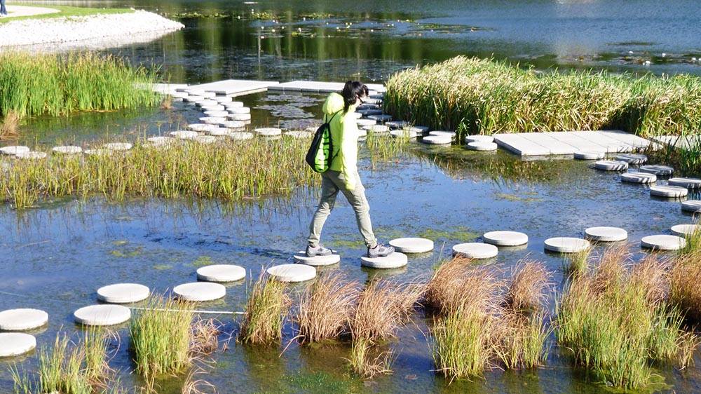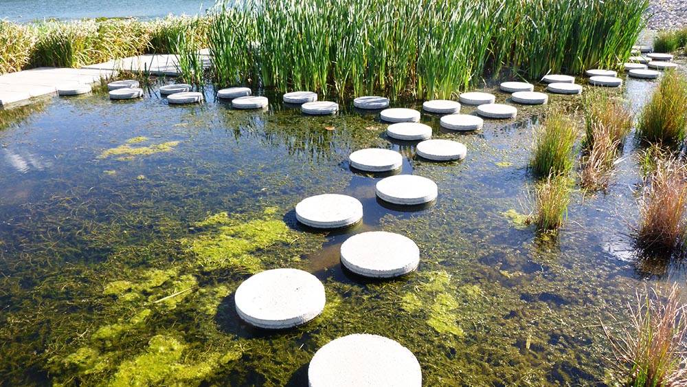 A tó szélén kör alakú betonoszlopokon lehet körbelépkelni a nádast.