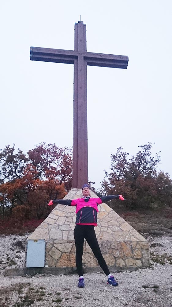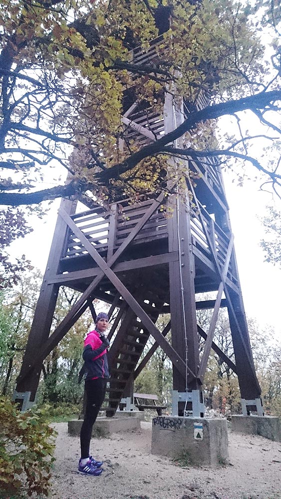 A Lóczy barlangig 3 km-t tettünk meg. Sajnos csak május 1 és szeptember 30-a között látogatható a barlang, így a bejáratnál fotózkodtunk egyet, majd folytattuk a futást a zöld jelzésen fel a Jókai-kilátóhoz. Itt kezdődött az igazi hegymenet számunkra! Csak futottunk-futottunk felfelé, de csak nem akartunk odaérni a kilátóhoz. Aztán végre-valahára a dombtetőn (315 m) találtuk magunkat a kilátó lábánál. Felmásztunk a kilátóra, ahonnan csodálatos panoráma tárult a szemünk elé. Kár, hogy már szürkület volt, így nem sok időnk maradt gyönyörködni, ha még a töksötét előtt szerettünk volna visszaérni a szállásunkra.