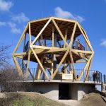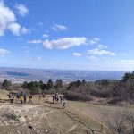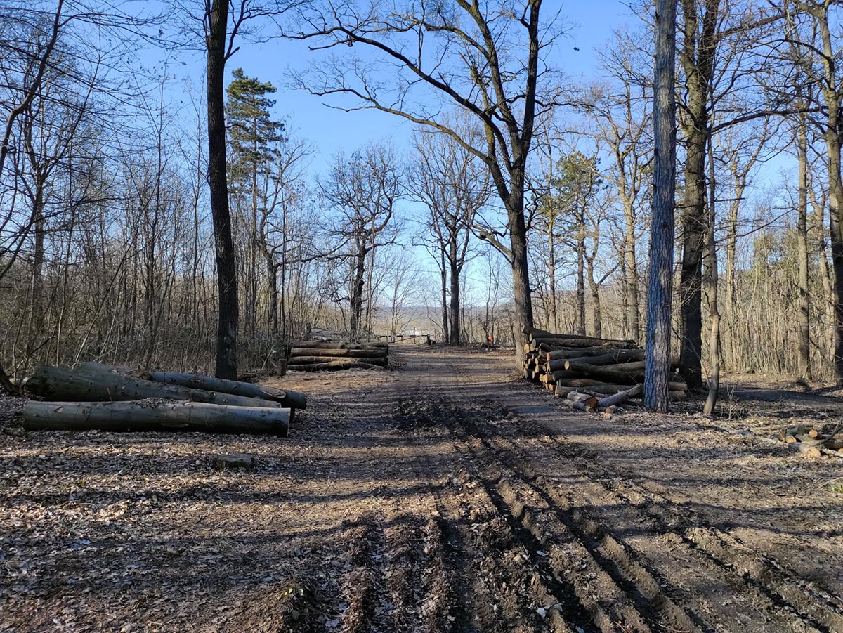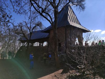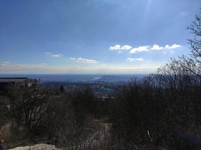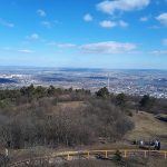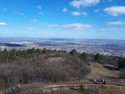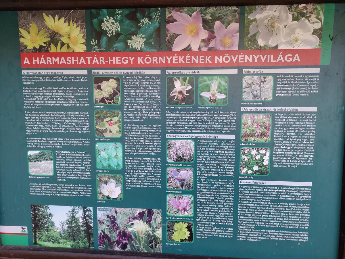 Innen lefelé vezetett az útunk, egészen a Szépvölgyi útig, amin áthaladva kezdhettük meg a Hármashatár-hegy bevételét. (Közel van ide a Pál-völgyi-, ill. a Szemlőhegyi-barlang.) A csúcstámadás előtt azért gyorsan bedobtunk egy-egy unicum szilvát a Fenyőgyöngye vendéglőben. Nem vészes az emelkedő, csak a nagy rádió-adótorony utáni végső köves kaptatós szakasz nehezebb egy kicsit. Fent elköltöttük a jól megérdemelt ebédünket, az előre csomagolt szendvicseinket. A Hármashatár-hegy neve Buda, Óbuda és (Pest)Hidegkút határára utal, mely 1873-ig, Budapest egyesítéséig létezett. (Útközben a kalandorok a határköveket is megkereshetik.) A bélyegzőt a fenti adótorony kerítése melletti póznán találjuk, de van egy másik is a túloldalon, az erdei iskolánál. Több ponton is csodálatos a panoráma a kopár hegytetőn, (elhagyatott bunker árulkodik a II. vh-ról, ill. a vitorlásrepülés is kapott egy emlékkövet), ráadásul felmehetünk a Guckler Károlyról elnevezett hatszög formájú egy emelet magas kilátóba is (495 m), mely 2016-ban épült. (HHH Emlékéremnyomó-automata a lépcső tövében: 2*100 Ft + 5 Ft.) Az erdőmester nevéhez a Budai-hegység beerdősítése fűződik, ill. a közeli túrasétány (Hármashatár-hegy – Csúcs-hegy) kiépítése. A kilátót megkerülve a pilótaparkban található Rotter Lajos magyar gépészmérnök, repülőgép-tervező és pilóta, a Karakán és a Nemere vitorlázó repülőgépek tervezőjének mellszobra. Környezetében egy étterem-fogadó, erdei iskola, egy éppen épülő rendezvényközpont, a felújított hármashatár-hegyi turistaház, ill. wc található.