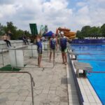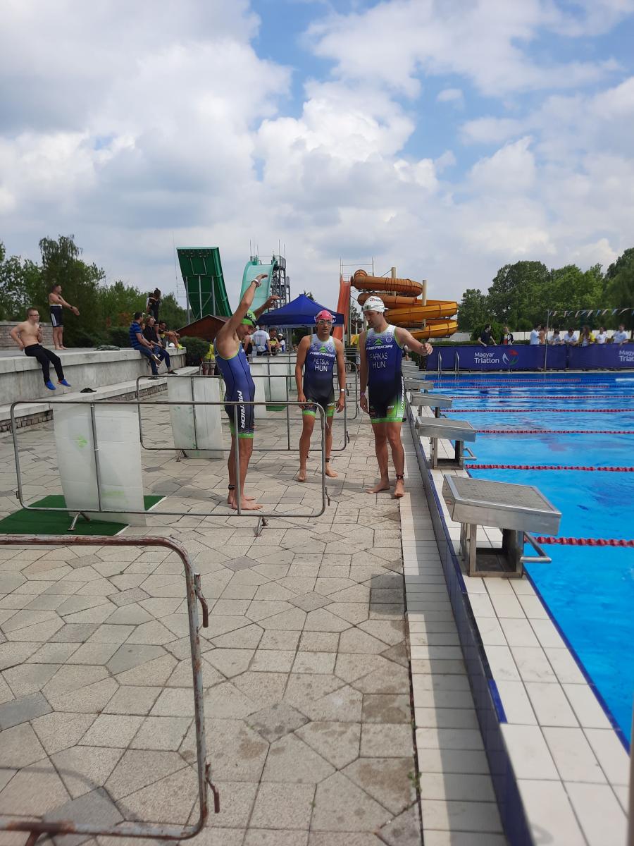A strand 50-es medencéjében zajlott, időpontra indítottak, szerencsére csak miénk volt a sáv, mikor elrajtoltunk. Jól ment, túlteljesítettük az 1:45-ös tervet, amit a közös edzések alapján lőttünk be. Zoli ment elöl, aki többször hátúszásra váltott, hogy megnézze hol jövünk, de nagyjából végig ott voltunk a lábvizén. Én úsztam mögötte, utánam meg az Iván. Hány hosszt kell úszni? 15-öt. Nem tudtam számolni, de szerencsére a Zoli igen. Kimászás után, mikor a pulzusunk az egekben már magyarázza nekünk, hogy vegyünk levegőt, meg azt is, hogy rázzuk le magunkat.